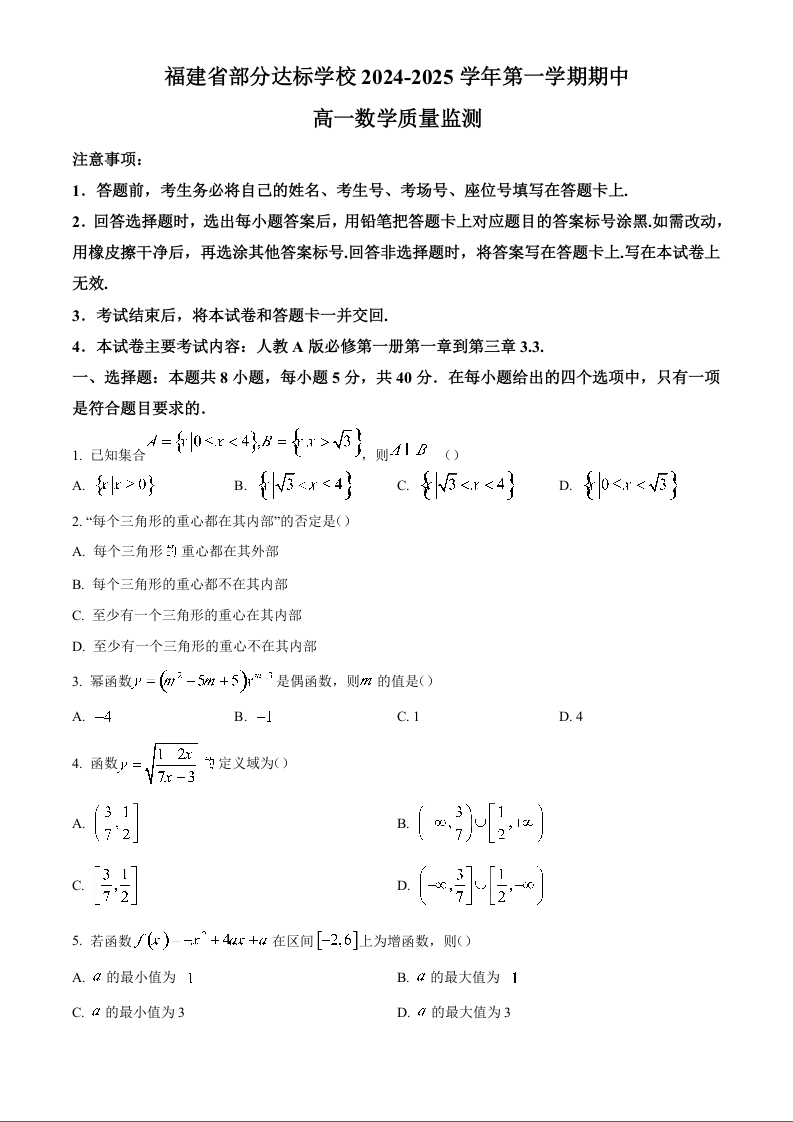 福建省部分达标学校2024-2025学年第一学期期中考试数学+答案