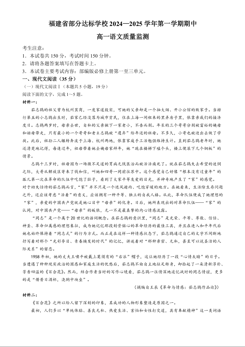 福建省部分达标学校2024-2025学年第一学期期中考试语文+答案