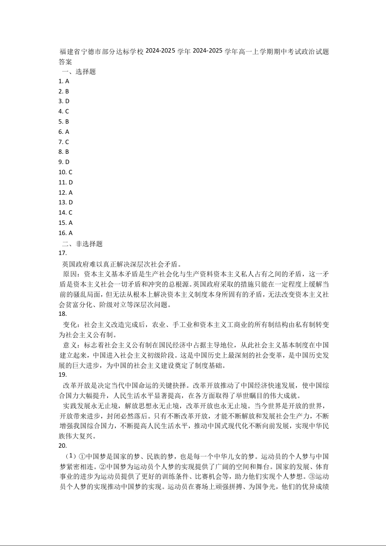 福建省部分达标学校2024-2025学年第一学期期中考试政治答案