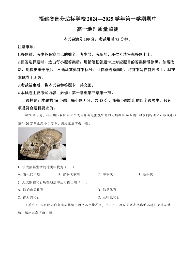 福建省部分达标学校2024-2025学年第一学期期中考试地理+答案