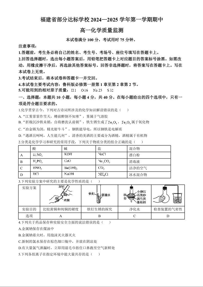 福建省部分达标学校2024-2025学年第一学期期中考试化学+答案
