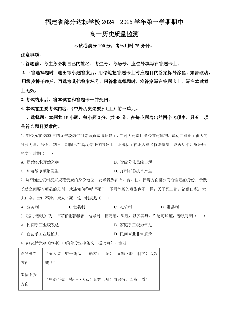 福建省部分达标学校2024-2025学年第一学期期中考试历史+答案