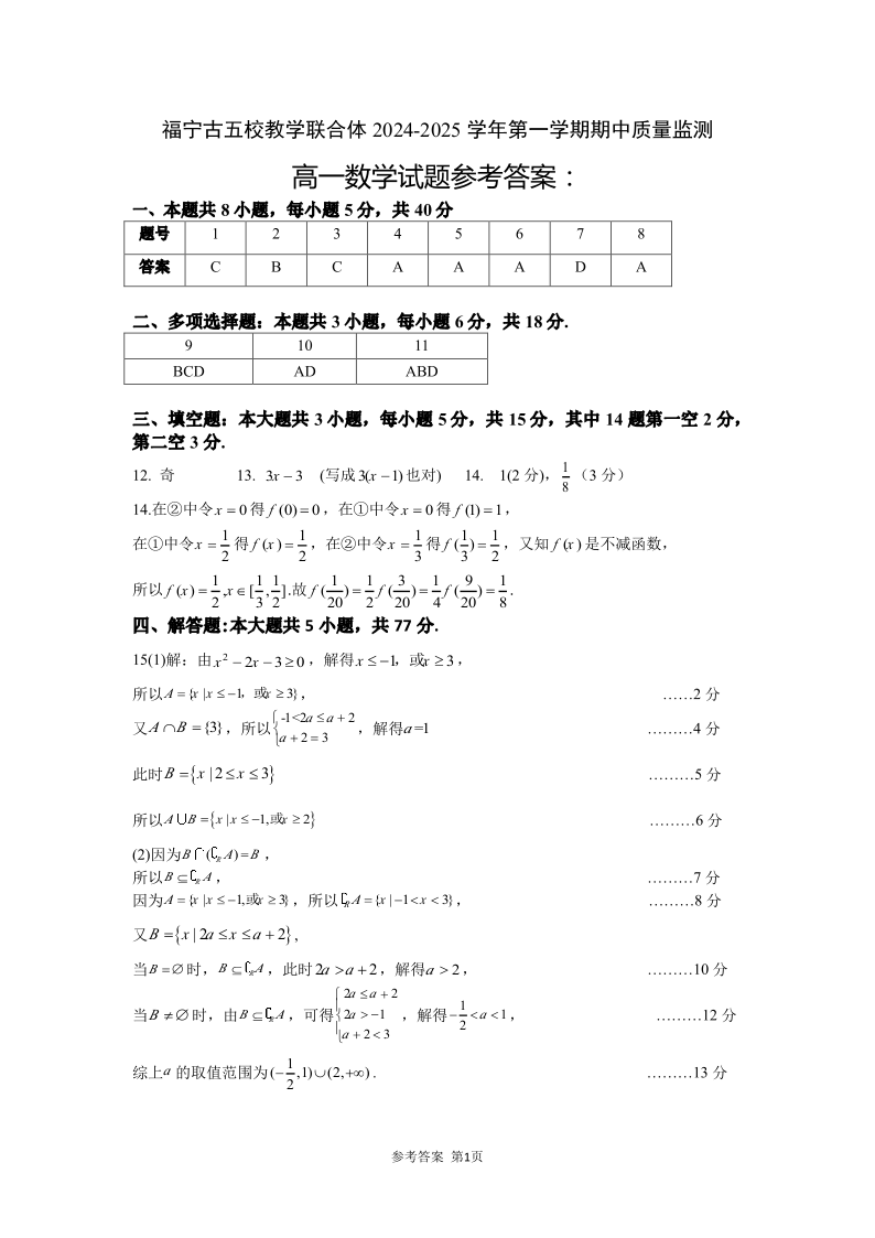 福建省福宁古五校教学联合体 2024-2025 学年第一学期期中质量检测数学答案