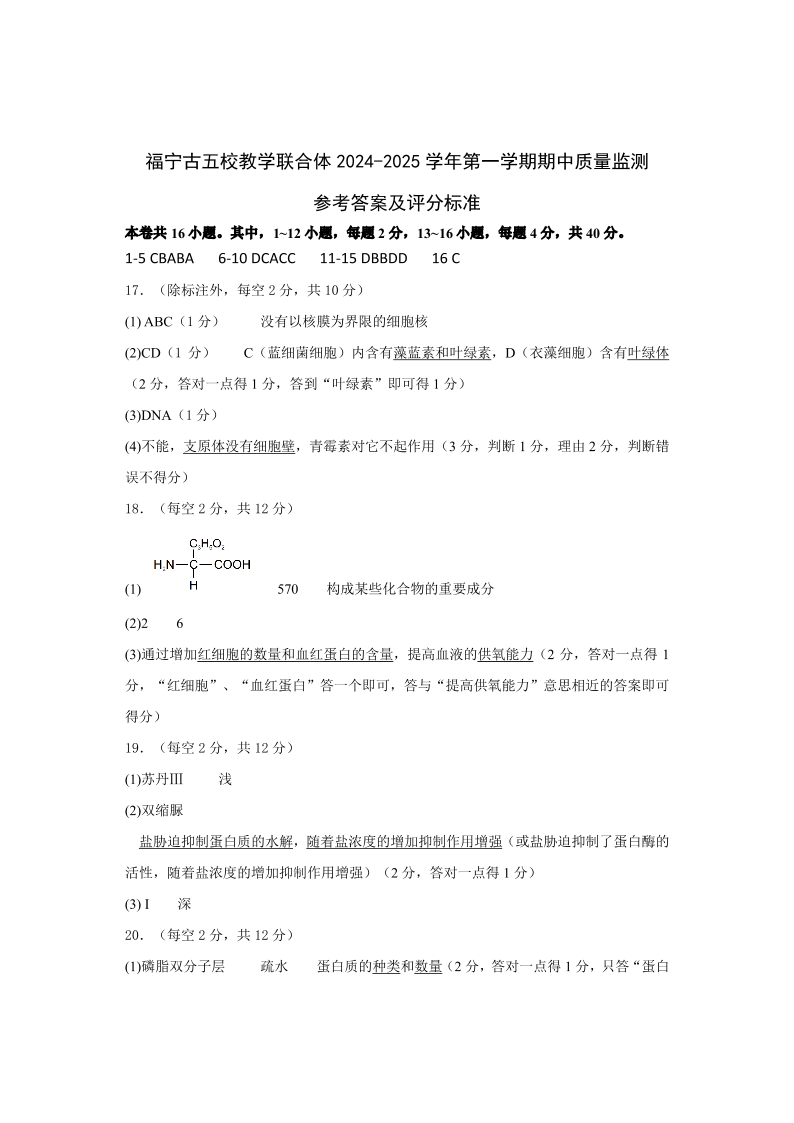 福建省福宁古五校教学联合体 2024-2025 学年第一学期期中质量检测生物答案