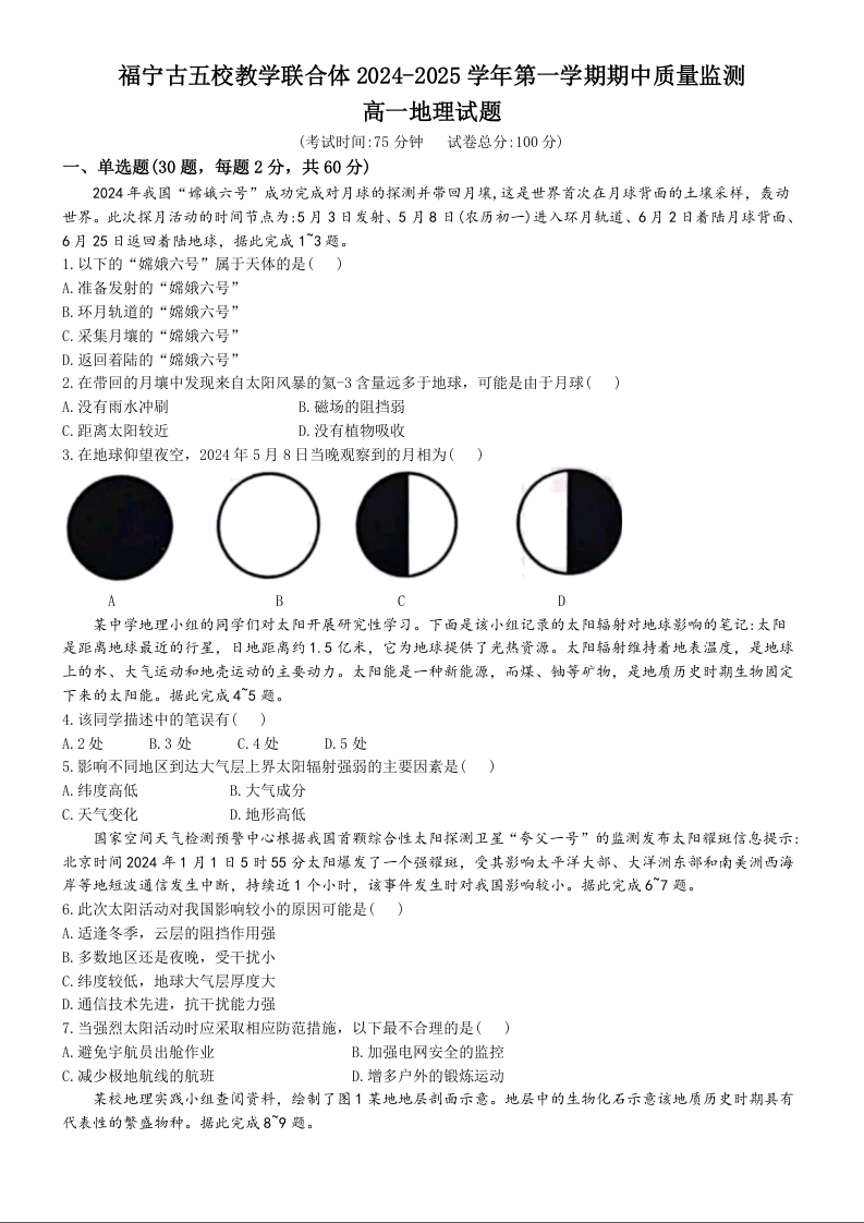 福建省福宁古五校教学联合体 2024-2025 学年第一学期期中质量检测地理