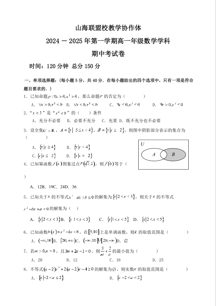 福建省福州市山海联盟校教学协作体2024-2025年第一学期高一年级期中考试卷数学