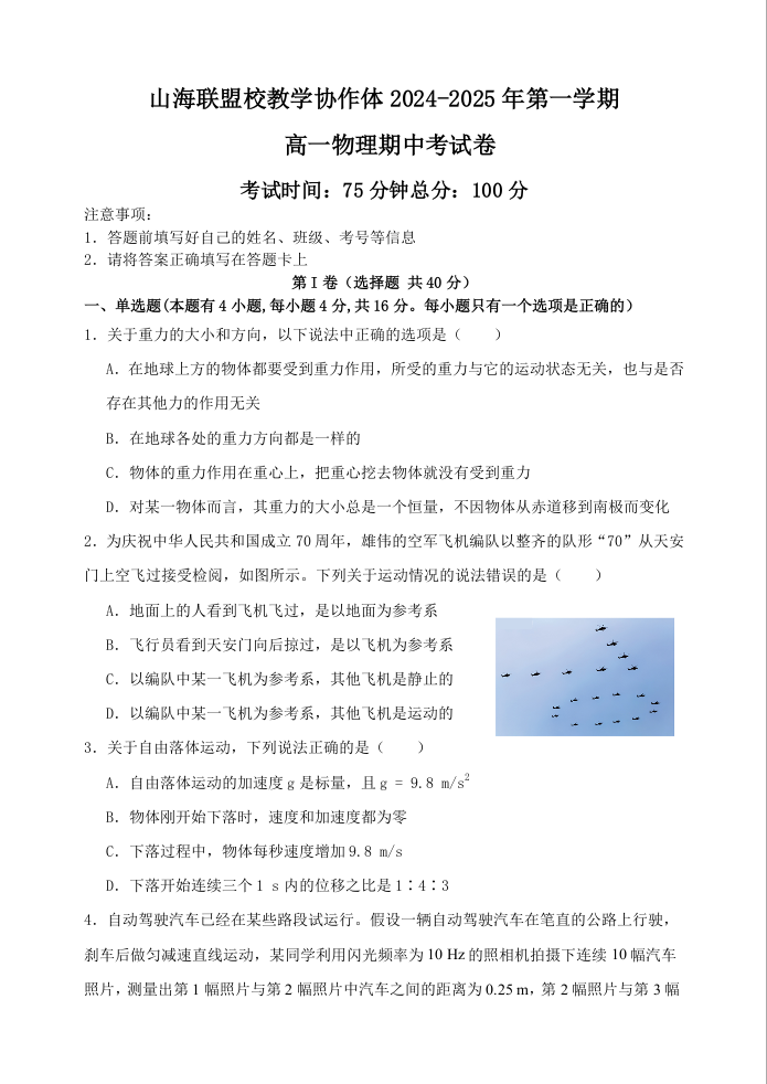 福建省福州市山海联盟校教学协作体2024-2025年第一学期高一年级期中考试卷物理+答案