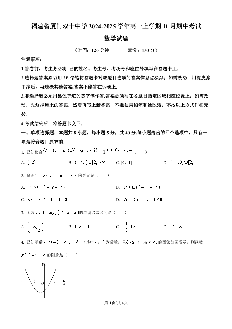福建省厦门双十中学2024级高一上学期期中考试数学试题(原卷版)