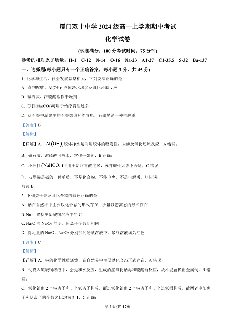 福建省厦门双十中学2024级高一上学期期中考试化学试题(解析版)