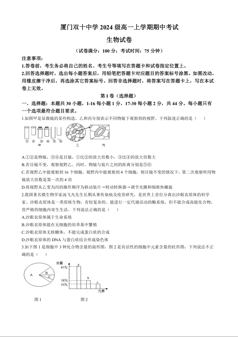 福建省厦门双十中学2024级高一上学期期中考试生物