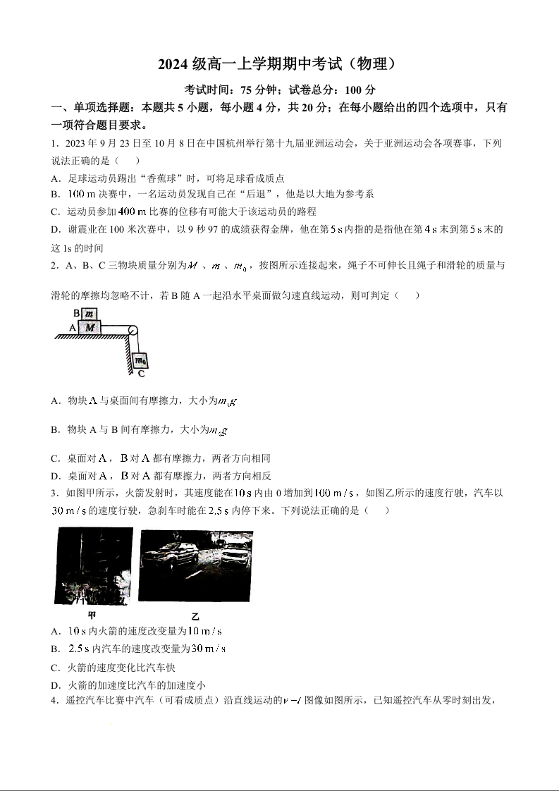 福建省厦门双十中学2024级高一上学期期中考试物理
