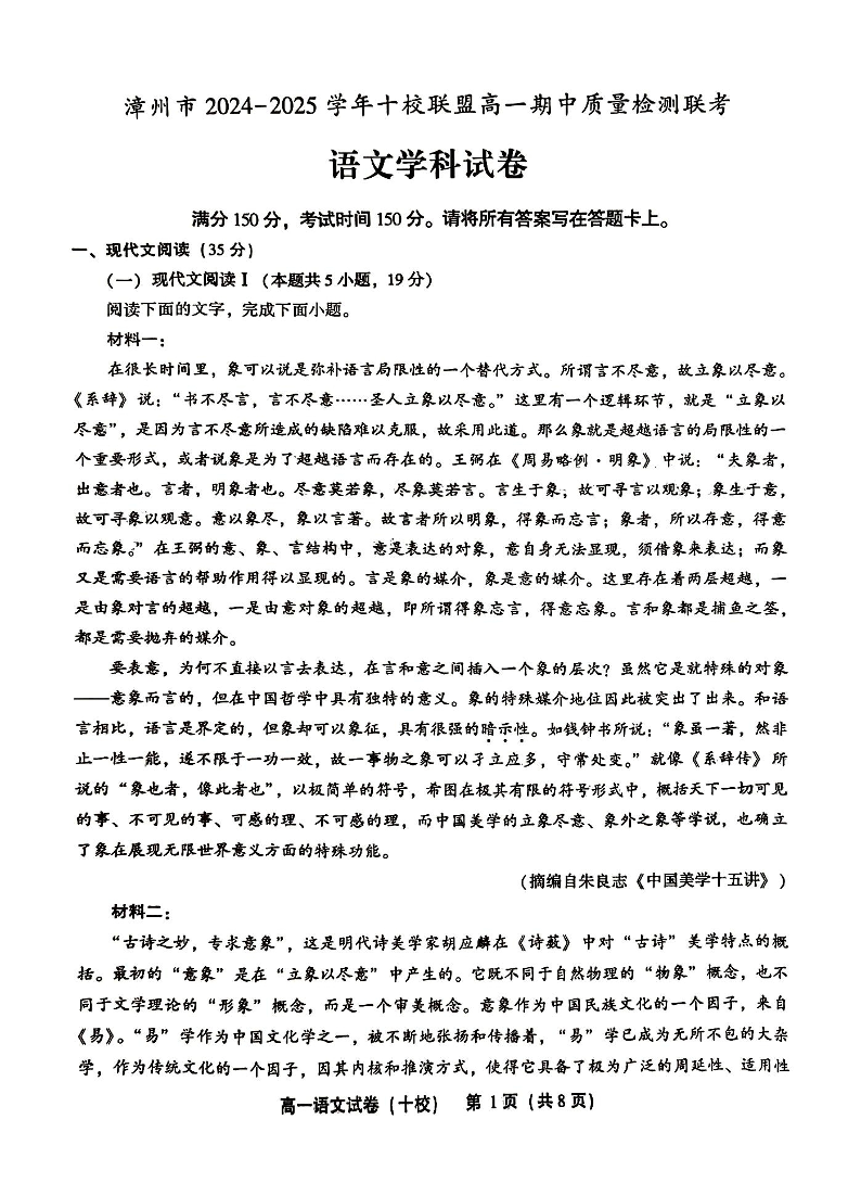 福建省漳州市2024-2025学年上学期十校联盟高一期中质量检测语文