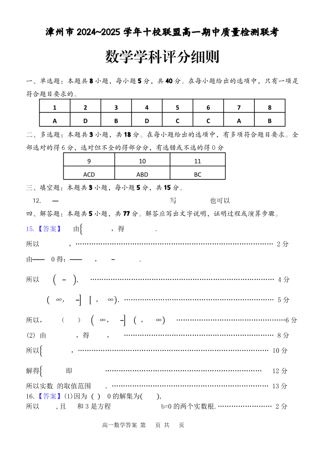 福建省漳州市2024-2025学年上学期十校联盟高一期中质量检测数学答案