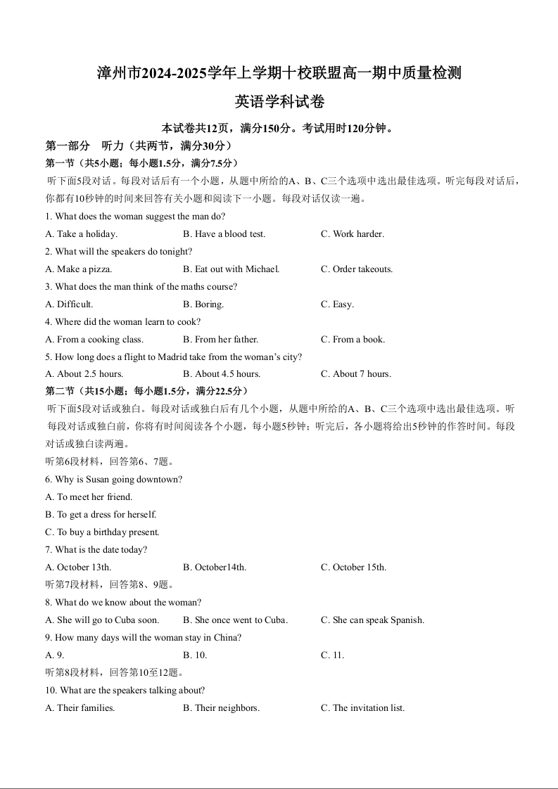 福建省漳州市2024-2025学年上学期十校联盟高一期中质量检测英语+答案