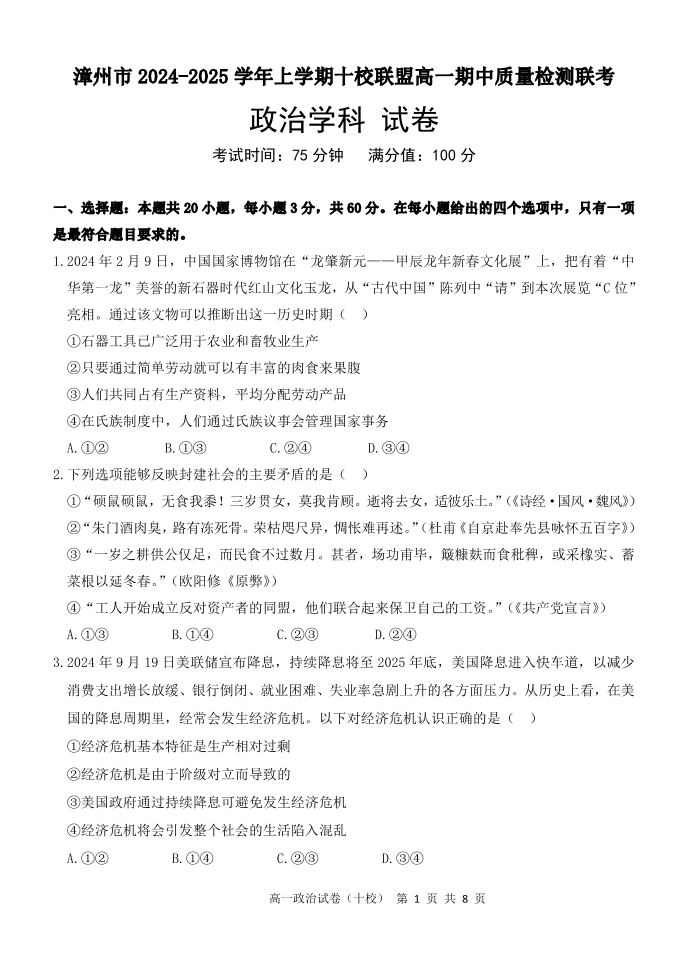 福建省漳州市2024-2025学年上学期十校联盟高一期中质量检测政治