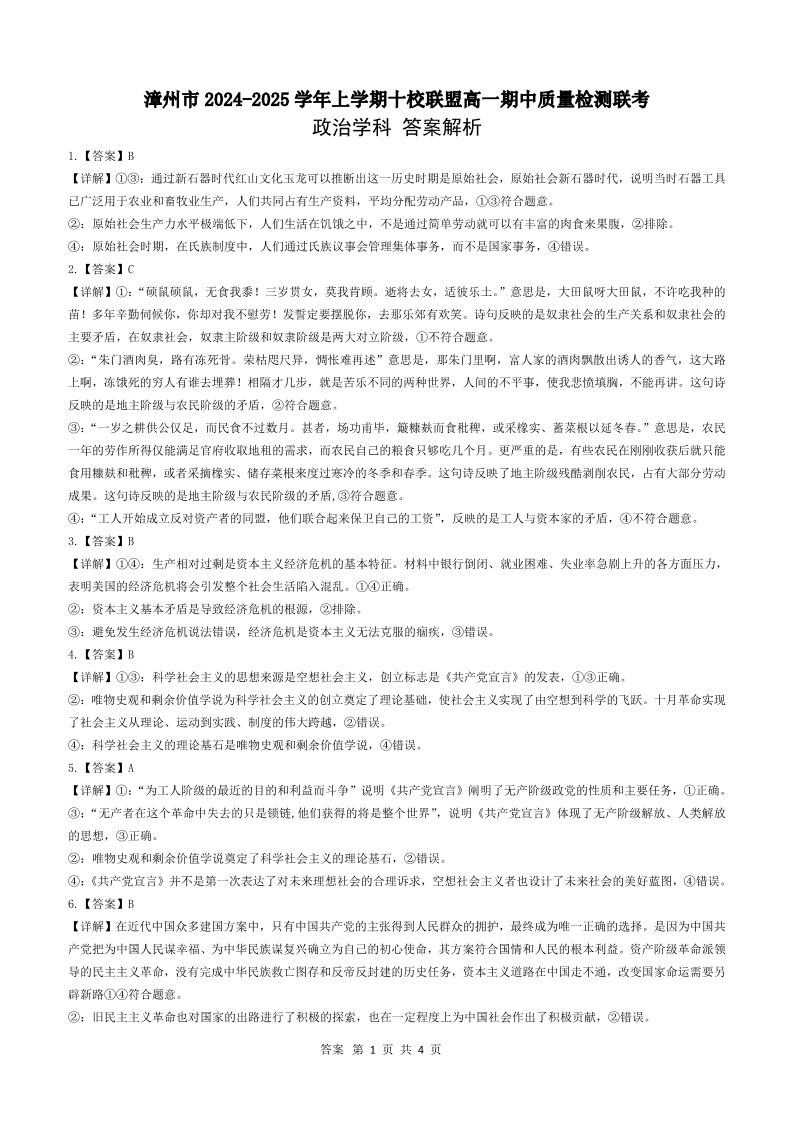 福建省漳州市2024-2025学年上学期十校联盟高一期中质量检测政治答案
