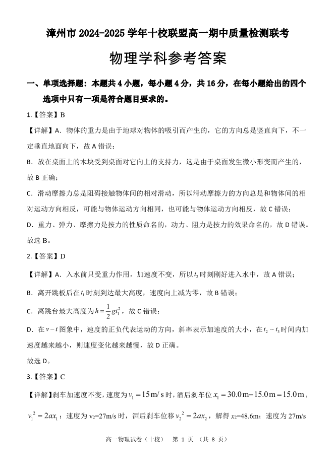 福建省漳州市2024-2025学年上学期十校联盟高一期中质量检测物理答案