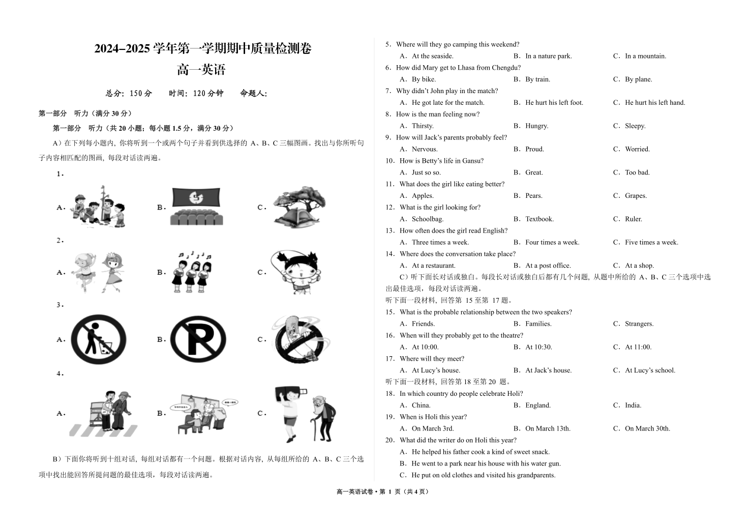 甘肃省武威市凉州区2024-2025学年第一学期期中质量检测卷英语