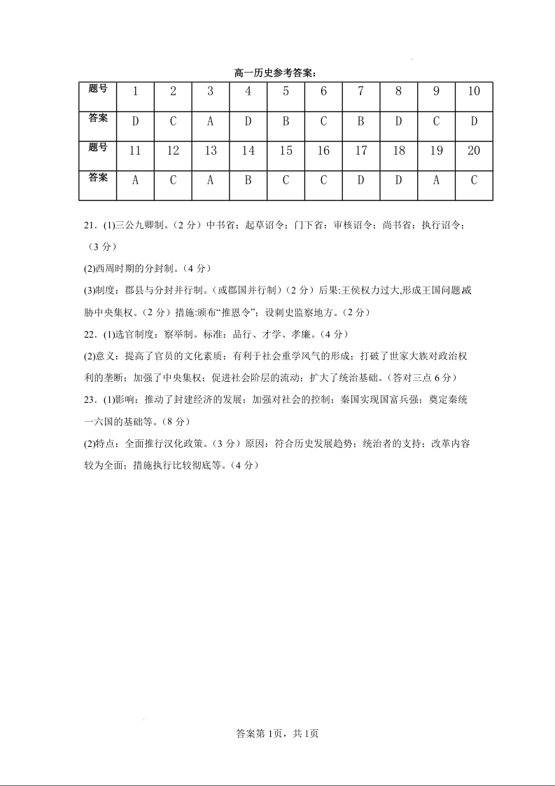 甘肃省武威市凉州区2024-2025学年第一学期期中质量检测卷历史答案