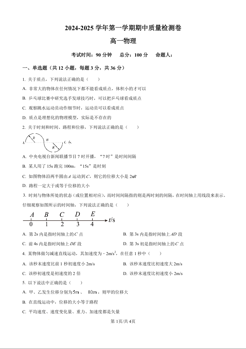 甘肃省武威市凉州区2024-2025学年第一学期期中质量检测卷物理试卷(原卷版)
