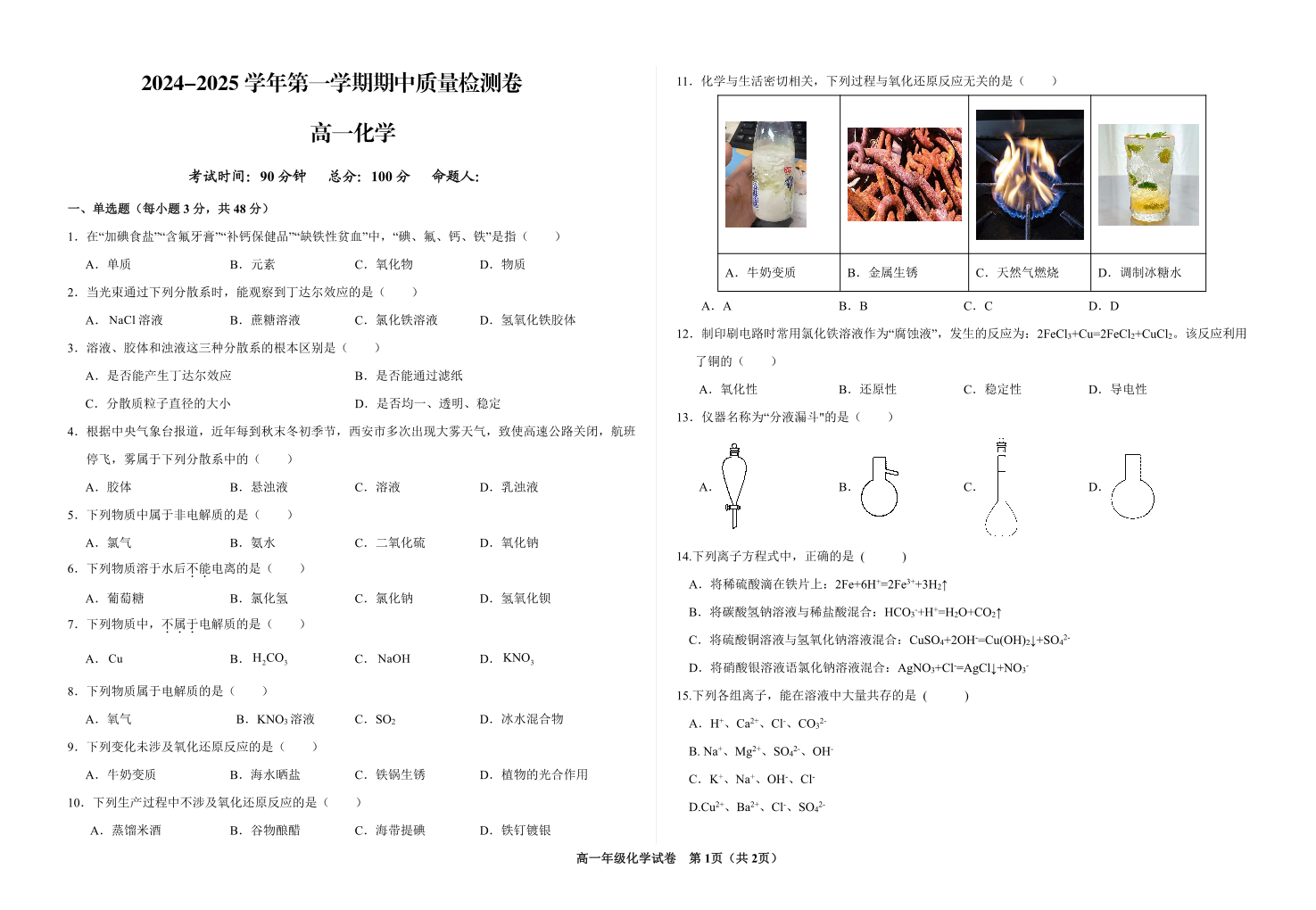 甘肃省武威市凉州区2024-2025学年第一学期期中质量检测卷化学