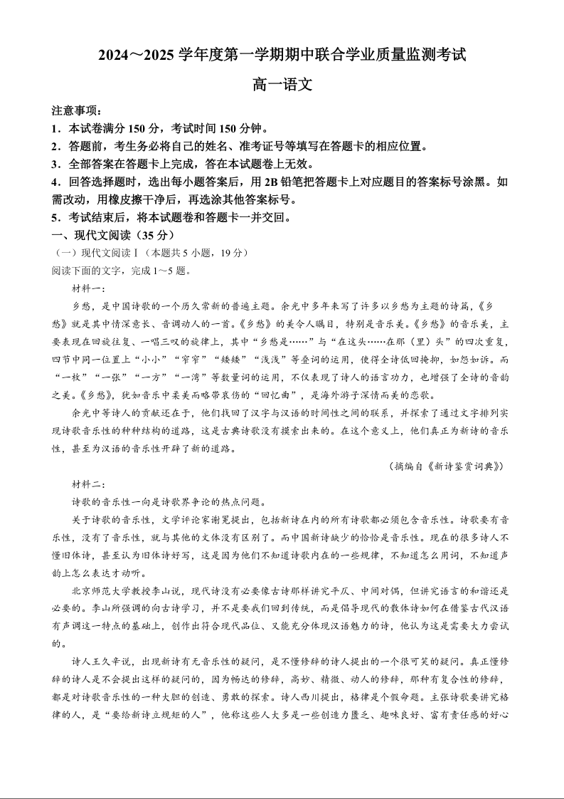 广东省清远市九校2024-2025学年度第一学期期中联合学业质量检测考试语文