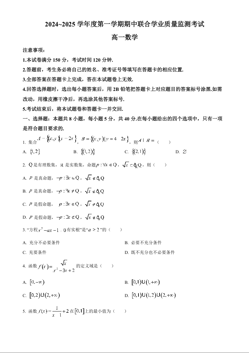 广东省清远市九校2024-2025学年度第一学期期中联合学业质量检测考试数学试题(原卷版)