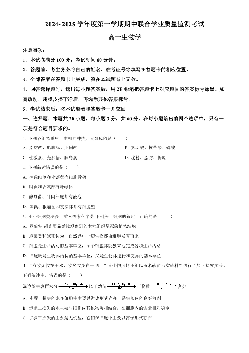 广东省清远市九校2024-2025学年度第一学期期中联合学业质量检测考试生物试题(原卷版)