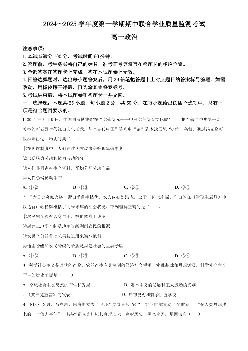 广东省清远市九校2024-2025学年度第一学期期中联合学业质量检测考试政治试题(原卷版)