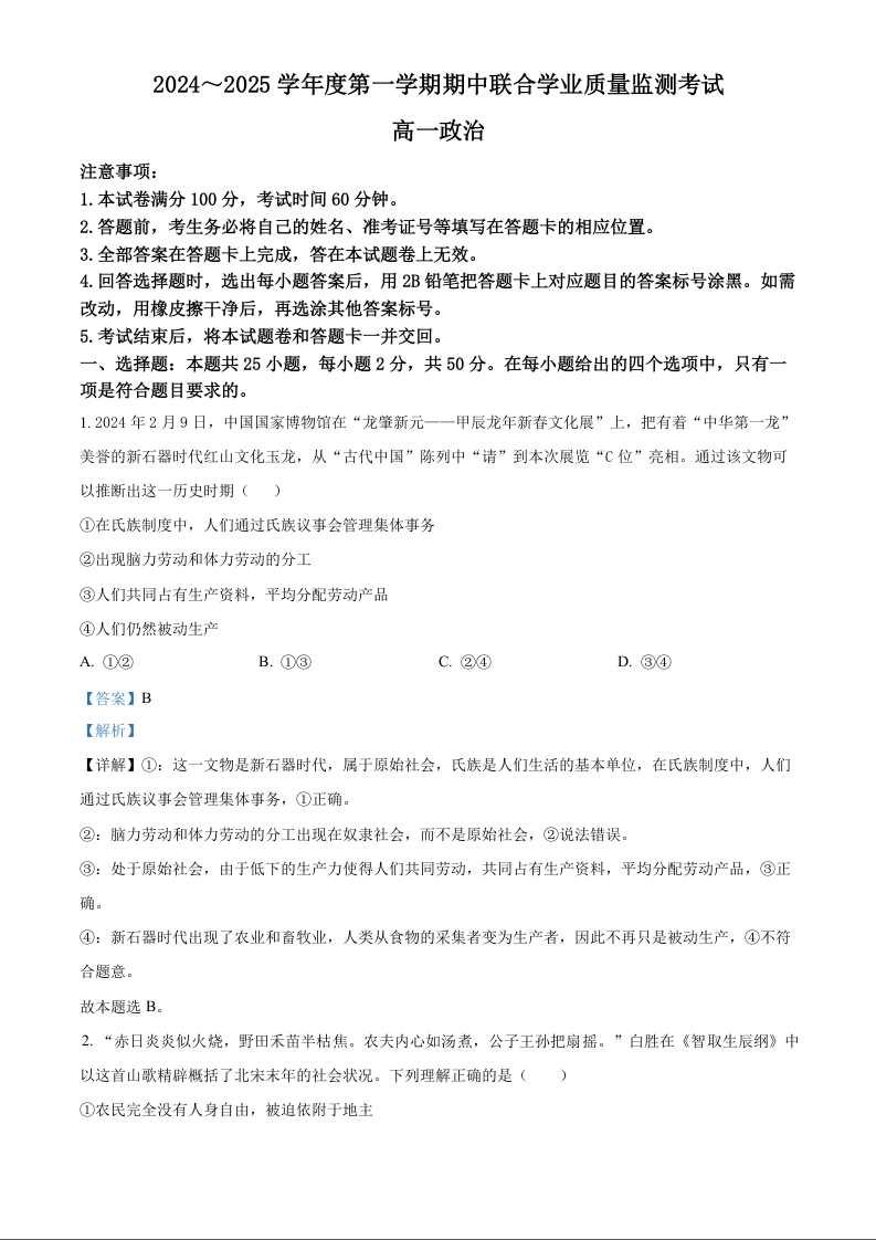 广东省清远市九校2024-2025学年度第一学期期中联合学业质量检测考试政治试题(解析版)