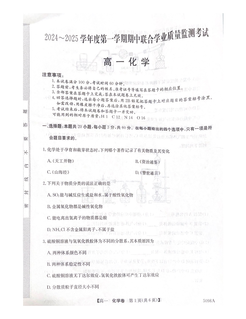 广东省清远市九校2024-2025学年度第一学期期中联合学业质量检测考试化学