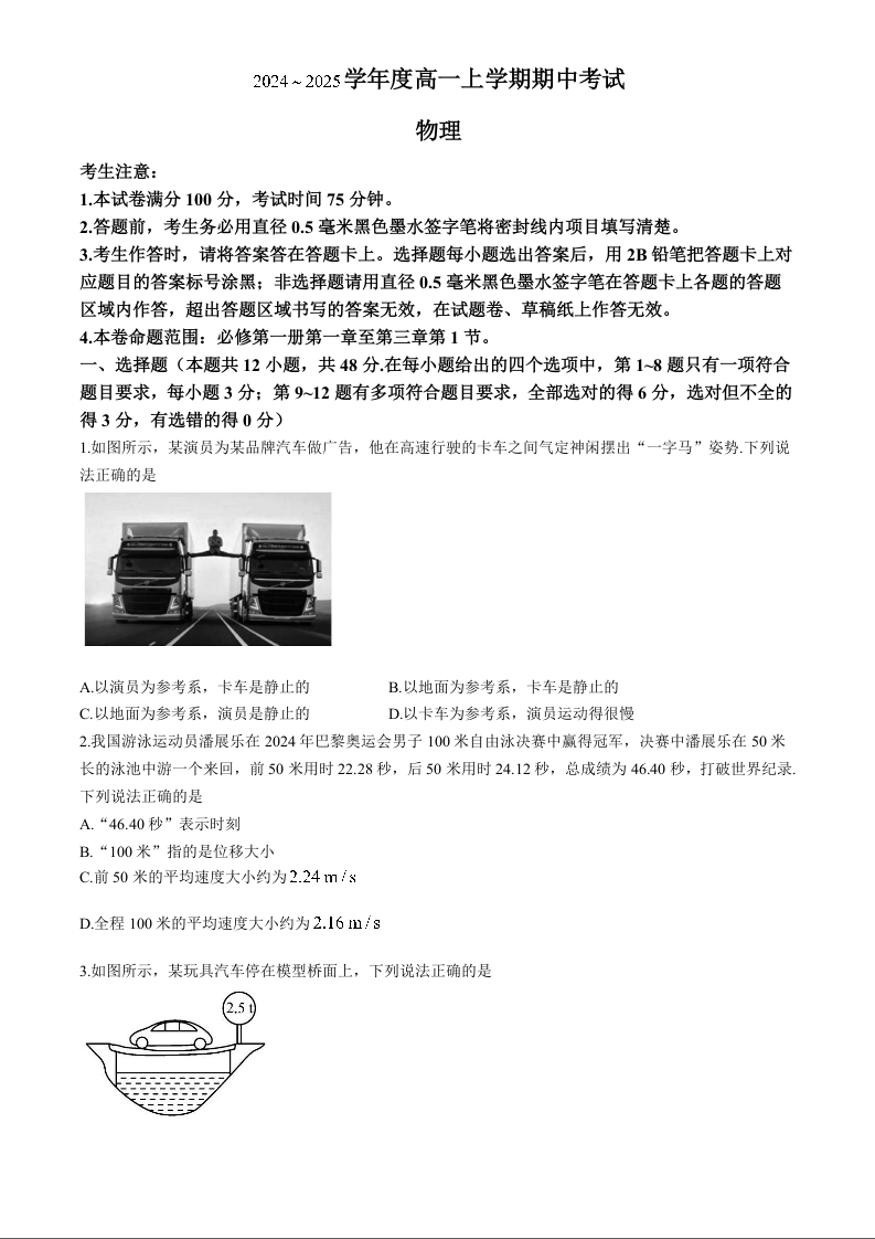 广东省深圳市部分学校2024-2025学年度高一上学期期中考试物理+答案