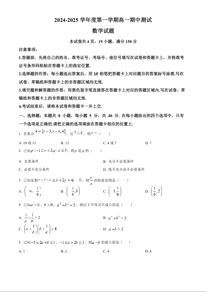 广东省阳江市高新区2024-2025学年度第一学期高一期中测试数学
