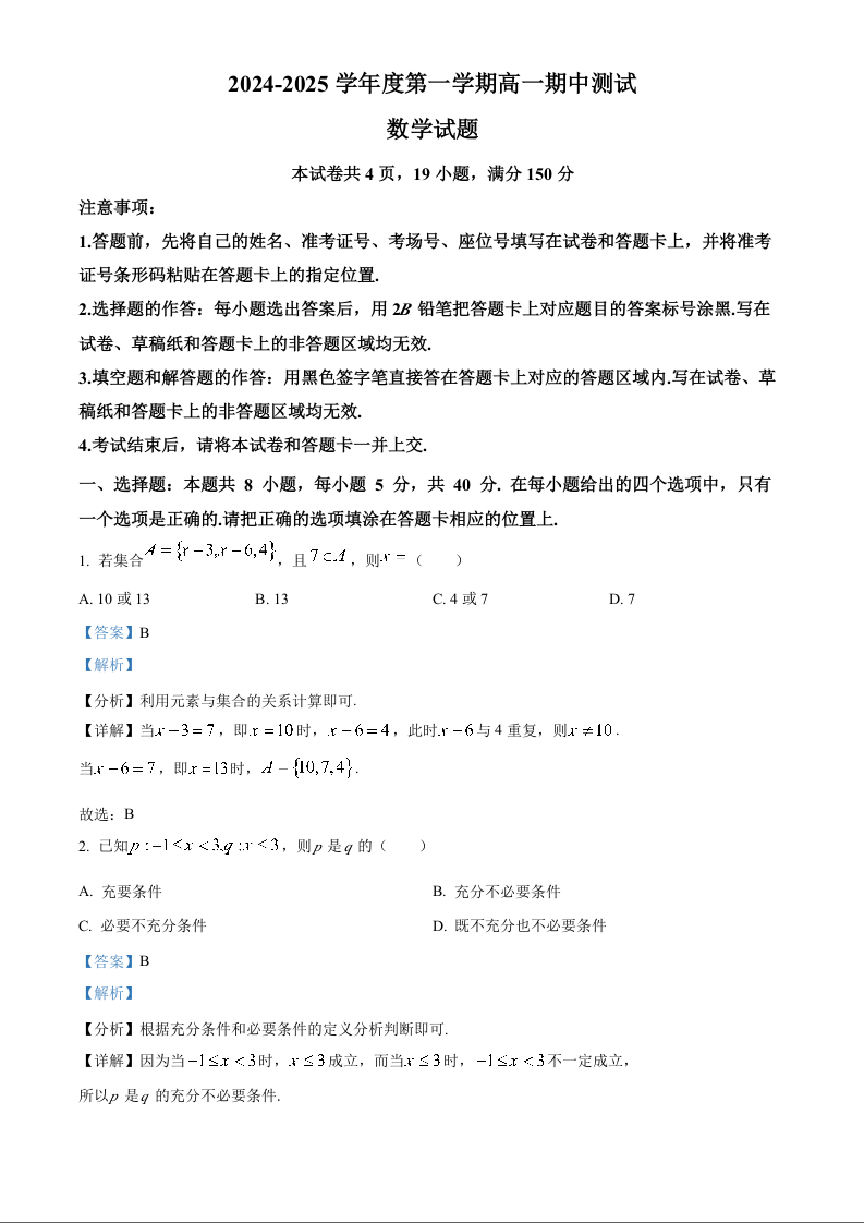 广东省阳江市高新区2024-2025学年度第一学期高一期中测试数学+答案