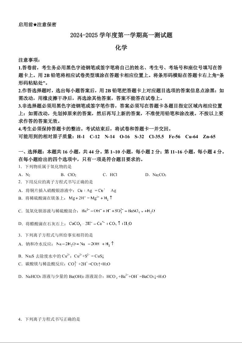 广东省阳江市高新区2024-2025学年度第一学期高一期中测试化学+答案