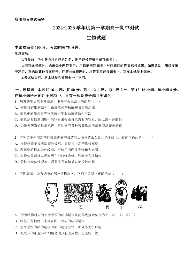 广东省阳江市高新区2024-2025学年度第一学期高一期中测试生物+答案