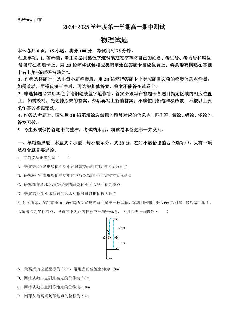 广东省阳江市高新区2024-2025学年度第一学期高一期中测试物理+答案