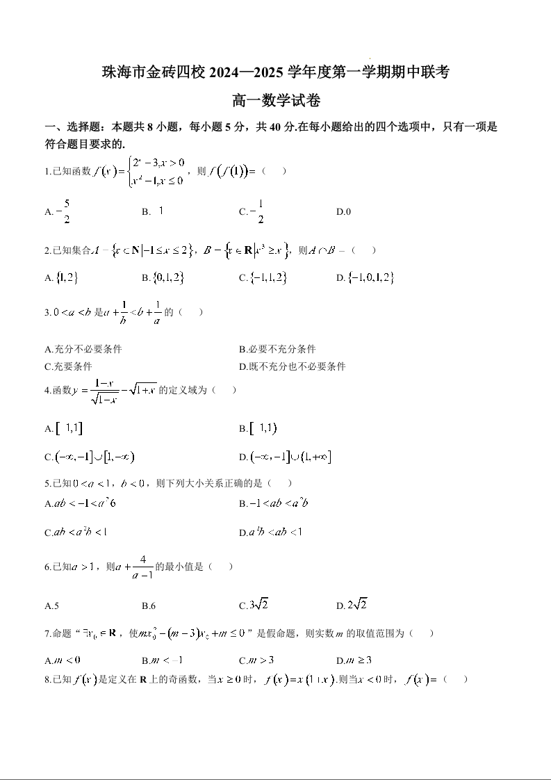 广东省珠海市金砖四校2024-2025学年度第一学期期中考试数学