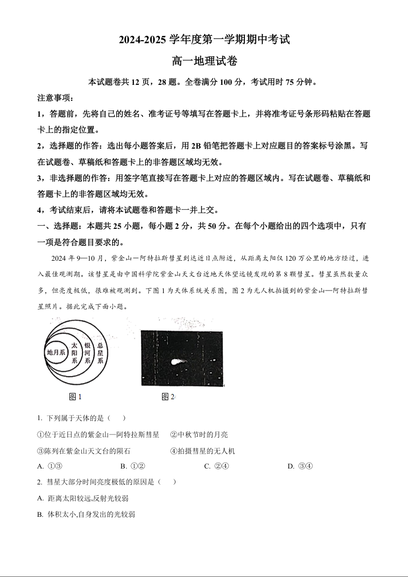 广东省珠海市金砖四校2024-2025学年度第一学期期中考试地理+答案