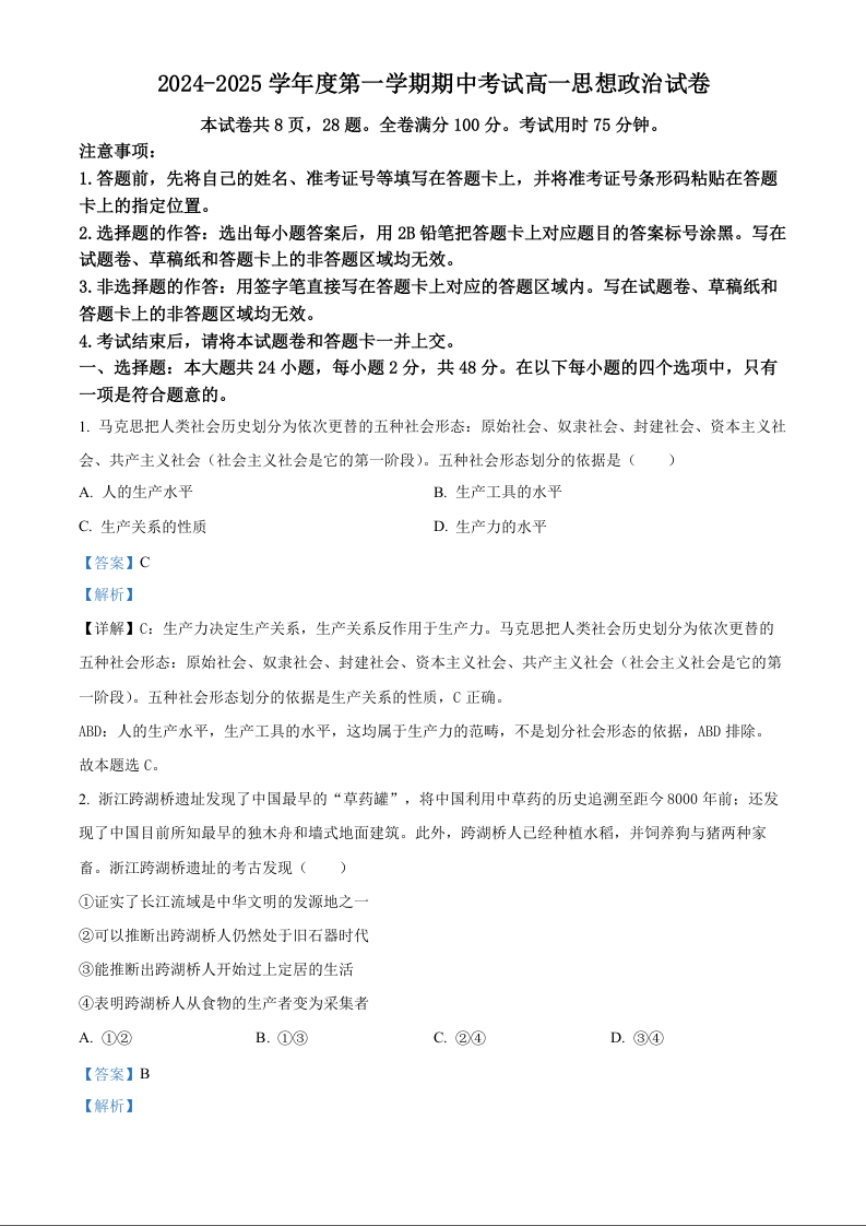广东省珠海市金砖四校2024-2025学年度第一学期期中考试政治+答案
