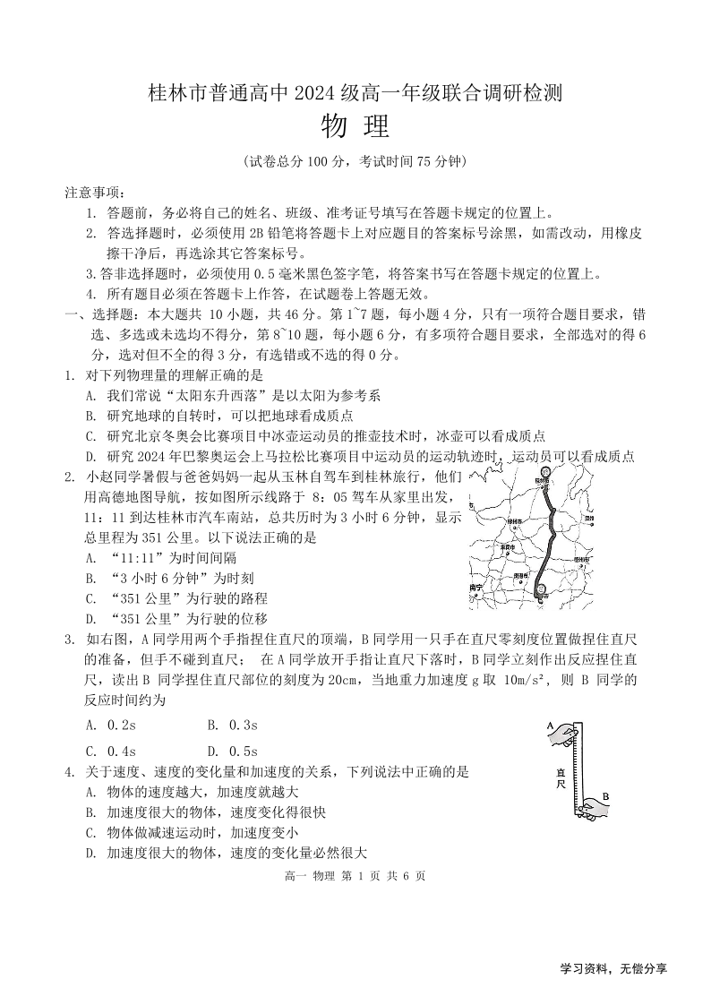 广西桂林市普通高中2024级高一年级联合调研检测物理