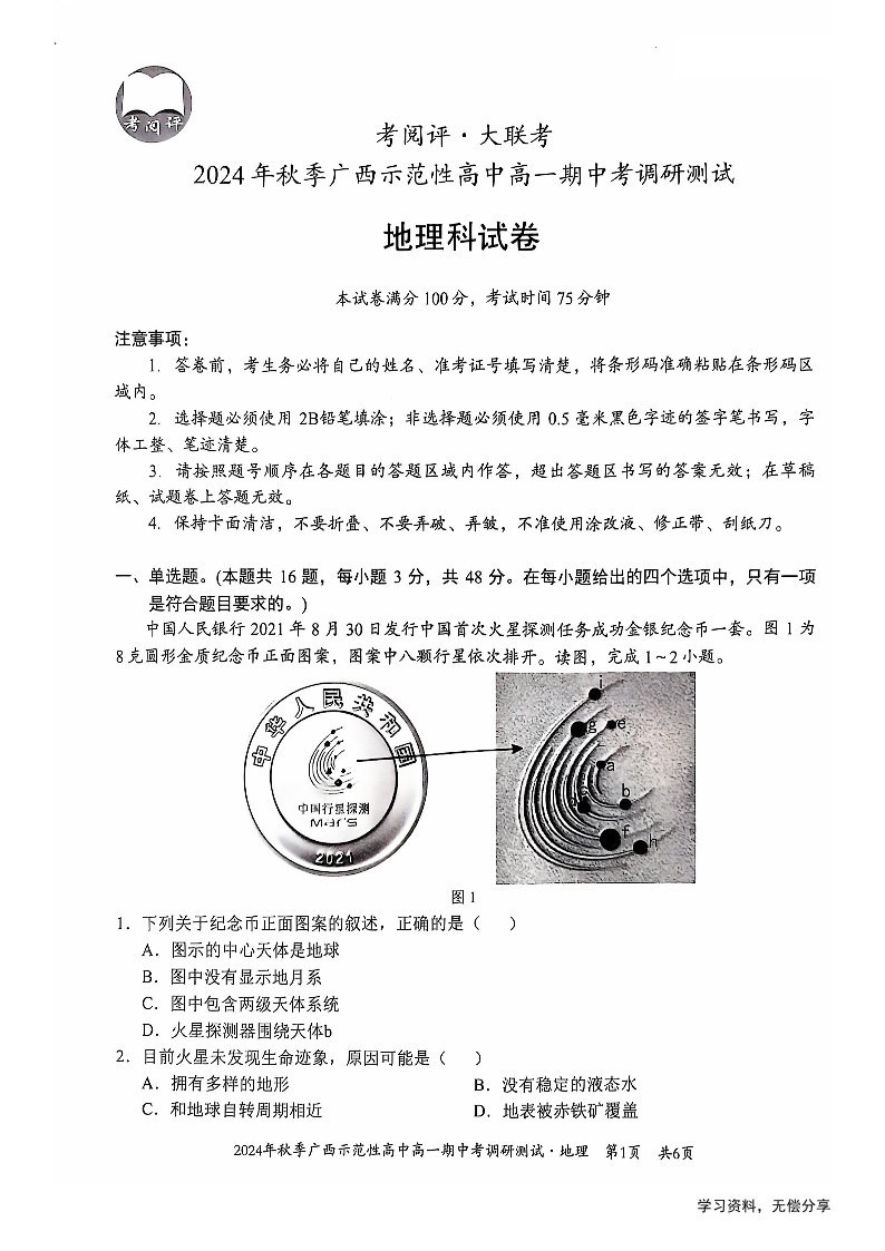 广西示范性高中2024年秋季高一期中考调研测试地理