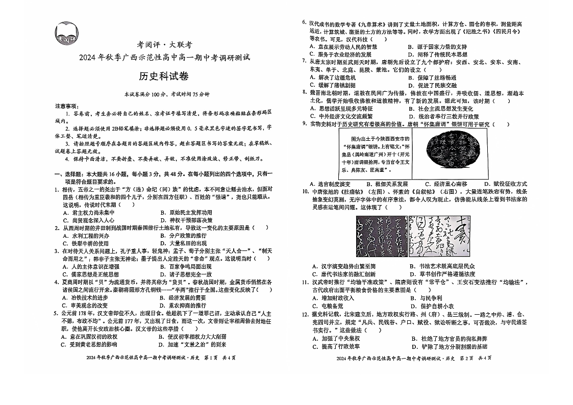 广西示范性高中2024年秋季高一期中考调研测试历史