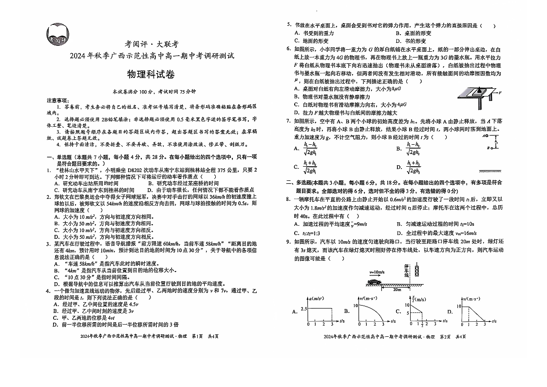 广西示范性高中2024年秋季高一期中考调研测试物理