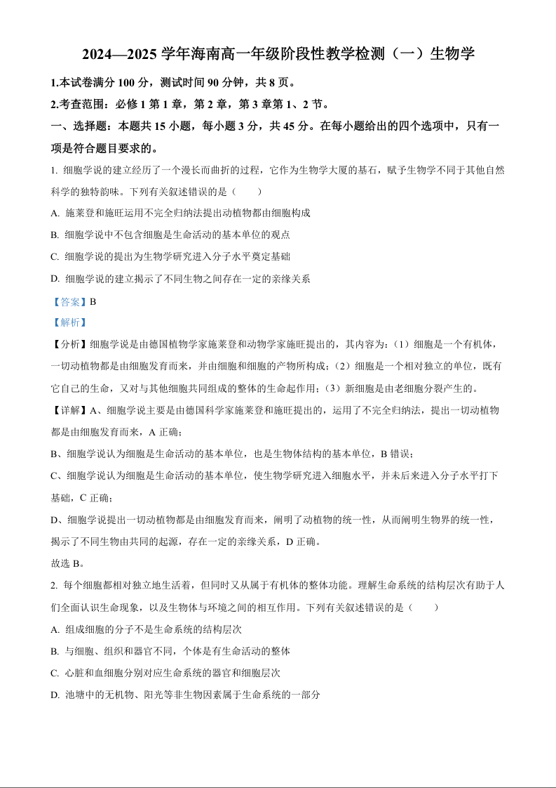海南省2024-2025学年高一年级阶段性教学检测(一)生物+答案