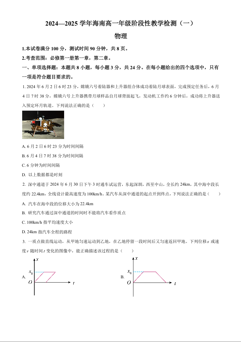 海南省2024-2025学年高一年级阶段性教学检测(一)物理