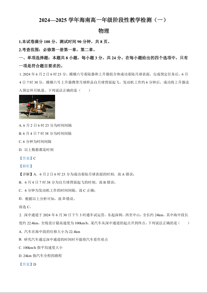 海南省2024-2025学年高一年级阶段性教学检测(一)物理+答案