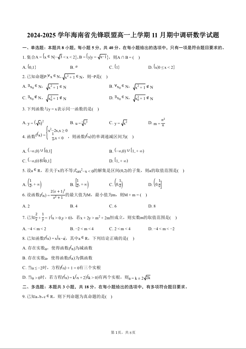 海南省先锋联盟2024-2025学年高一上学期11月期中调研试题数学+答案