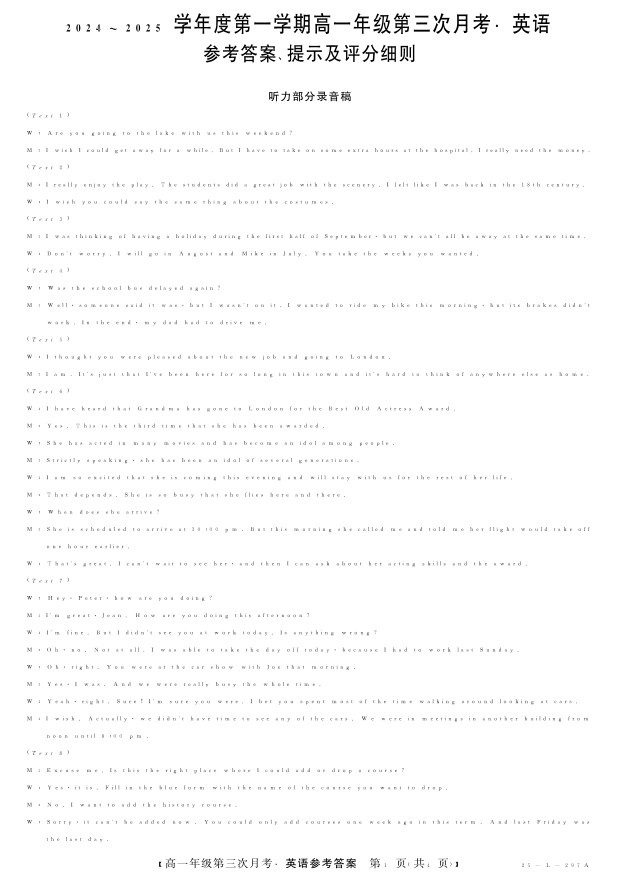 河北省2024-2025学年度第一学期高一年级第三次月考英语答案