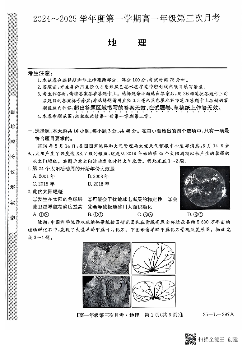 河北省2024-2025学年度第一学期高一年级第三次月考地理